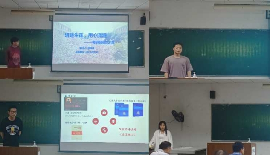刘恒炫、邓明浩、吴佳珊、杨迪四人依次分享了考研经验:刘恒炫鼓励大家结合自身实际,辨清方向,专注学业目标,合理规划考研计划;邓明浩发言时强调要“行动不止,挑战当头”,把握现在,成就未来;吴佳珊表示选择大于努力,适合自己的才是最好的;杨迪鼓励同学们敢于有梦、勇于追梦、勤于圆梦。现场问答环节,低年级员工就自己关注问题积极提问,高年级员工逐一进行了耐心细致解答。