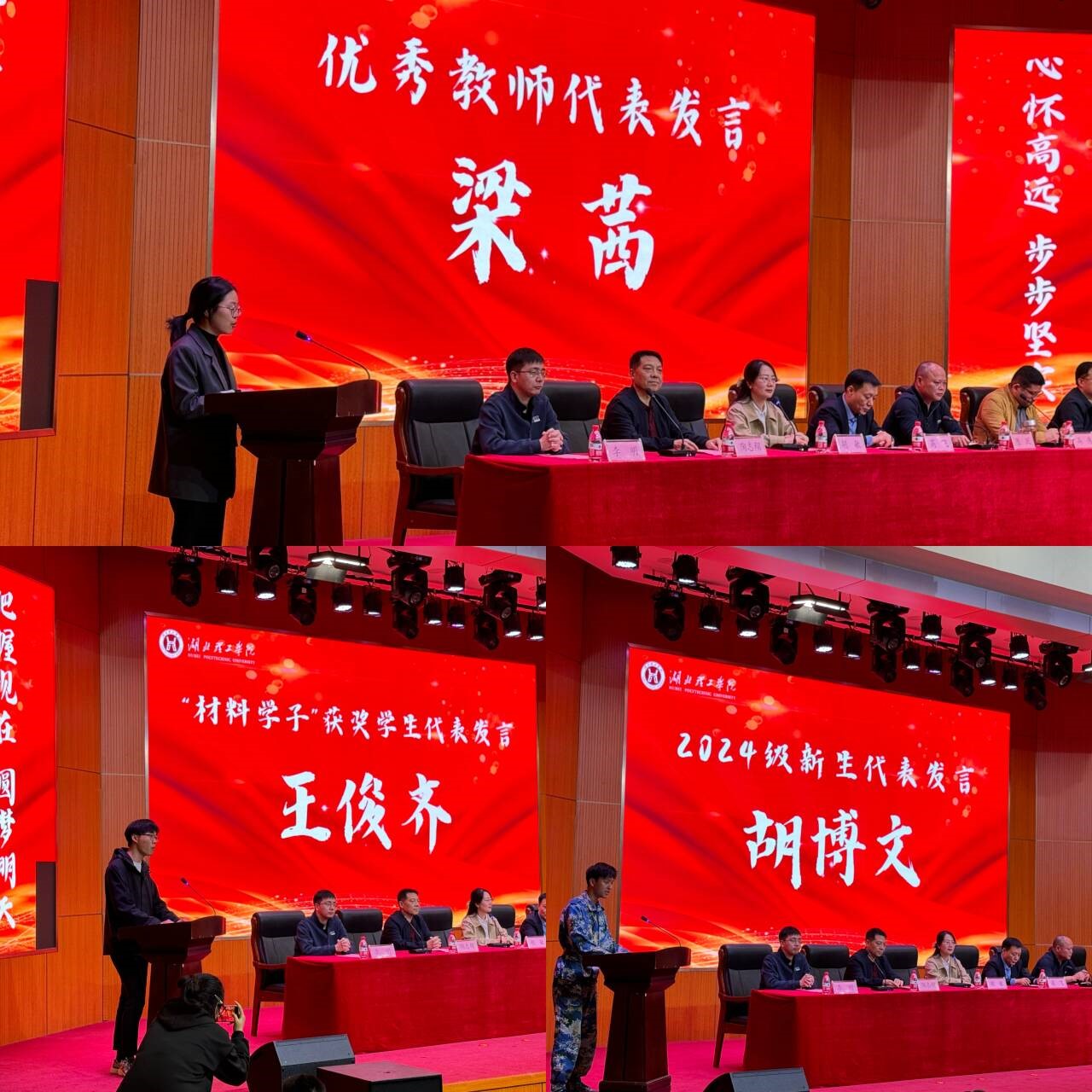 作为“材料学子”奖学金获奖代表,王俊齐同学分享自己在学习道路上的经验,并鼓励新生勇于挑战自我,不断进步。教师代表梁茜博士以真挚的语言勉励新生保持对知识的渴望,勇敢面对未来的机遇与挑战。新生代表胡博文在发言中表达对老员工活的期待,承诺会用积极的态度迎接新的挑战,努力成为一名优秀的材料学子。