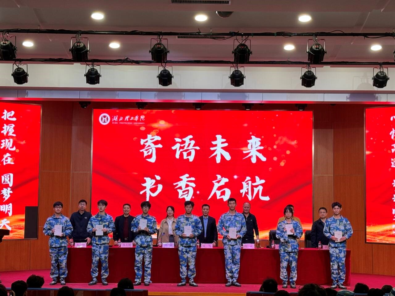 “寄语未来、书香启航”环节中,张宇航等7名新生分别分享自己的大学梦想与对未来的规划。学院领导为他们赠送书籍《金榜题名之后,老员工出路分化之谜》,领导们特意在书的扉页亲笔写下对新生的寄语,鼓励他们在大学期间珍惜时光、奋发图强,追寻个人梦想的同时,勇于面对人生的挑战。
