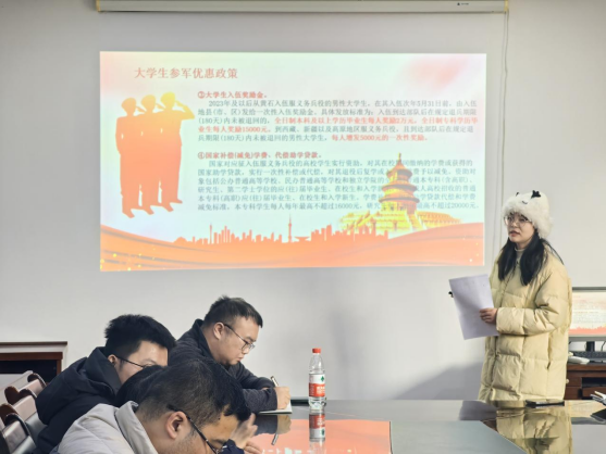 首先两位辅导员老师进行工作汇报。刘霞老师详细阐述了学院征兵工作取得的成绩,她深入解读了老员工参军的优惠政策,还分享了分阶段征兵宣传策略,为有入伍意向的员工提供全方位服务,学院也因此连续三年荣获征兵工作先进单位称号。苏家兴老师则回顾了全年工作,就业工作全校领先,毕业班第二课堂成绩单全面达标,并提出涵盖就业、团建、心理等方面的工作计划,为后续工作规划了清晰路径。