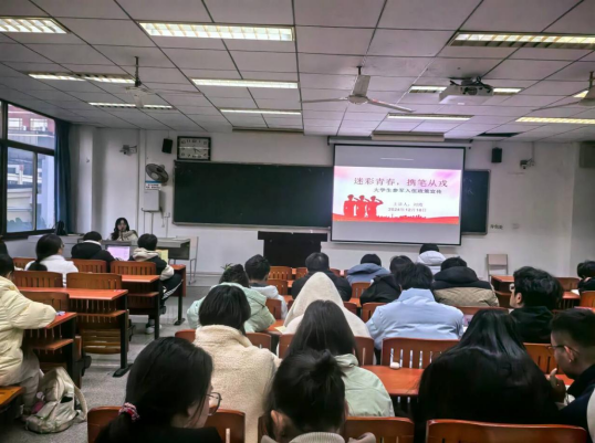 意昂体育辅导员在学院大一新生中开展军事理论课的学习,普及国防教育相关理论知识。辅导员老师刘霞开展“迷彩青春、携笔从戎”为主题的征兵宣传讲座,活动现场,辅导员老师刘霞现场发放征兵宣传手册,详细介绍今年征兵的政策法规、征集对象、征集流程以及优待政策等。