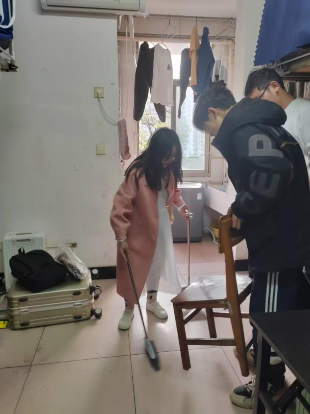 辅导员刘霞深入到员工寝室,对寝室的卫生、安全等方面进行了全面细致的检查,带领志愿者帮助员工一起打扫寝室,鼓励员工们积极参与创文活动,督促同学们对寝室进行清理整改,同时希望同学们能够自觉养成良好的卫生习惯,定期清理寝室,保持环境整洁,加强安全意识,注意用电安全,防范各类安全隐患。志愿者们积极发挥奉献精神,不怕脏、不怕累,弘扬志愿服务精神,彰显爱心善意和责任担当,共同营造卫生安全的寝室环境。