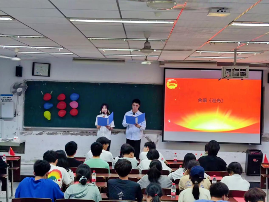 团会在黄倬和刘诗琪的精彩朗诵“青松礼赞”中拉开帷幕,他们用饱满的热情歌颂了青年青松般顽强不屈、不惧严寒、坚韧挺拔的精神品格;话剧《战火中的老员工》给我们带来了不一样的青年,他们心中满怀希望,有理想,有抱负,他们心系祖国,用自己满腔的热血在黑暗中摸索出光明的道路;2022级各班同学代表共同演绎的合唱《巡光》,慷慨激昂,歌声嘹亮,表现了青年积极乐观的人生态度;王晓洋与华俊强表演的配音秀《觉醒年代》铿锵有力,彰显了革命时期的青年的思想觉醒;最后团会在合唱《奔跑》中圆满落下帷幕。