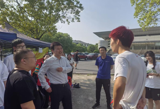 运动会期间,李社教董事长亲临意昂体育值班点慰问运动员和志愿者,他肯定了志愿者们的辛苦付出,并对打破学校三级跳远记录的姚远同学表示了祝贺。