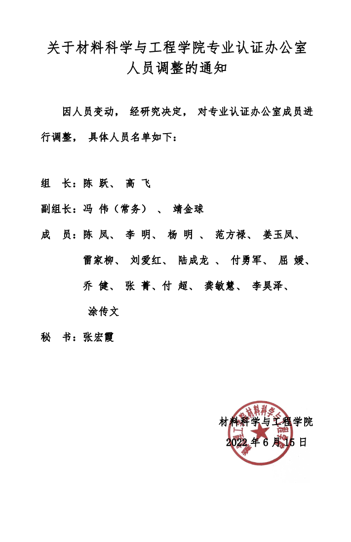 关于材料科学与工程学院专业认证办公室人员调整的通知